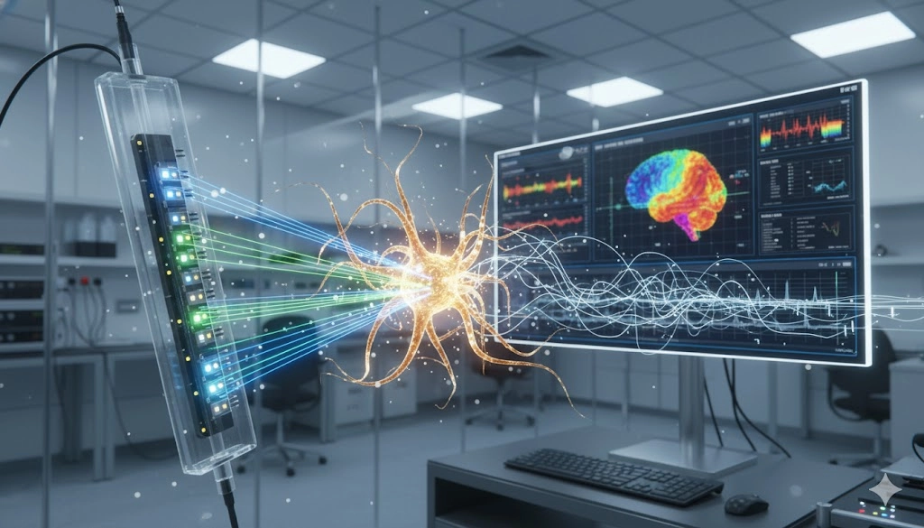 GEMINI (2025) The precise manipulation and simultaneous monitoring of biological function are central requirements for modern neuroscientific and cardiac research. The coupling of optogenetics, which provides cellular specificity and millisecond-level temporal resolution in controlling genetically defined cell populations, with electrophysiology integration, which offers the gold standard for measuring real-time electrical activity, represents a major technical leap. This synergistic combination is crucial for moving beyond correlation to establish definitive causal relationships within complex neural circuits, and recent advancements in probe design, fabrication, and data analysis are rapidly expanding the scope and scale of achievable experiments in the modern laboratory setting. The scale and complexity of neural circuits demand recording techniques capable of capturing activity from hundreds of neurons simultaneously while applying localized light stimulation. Traditional methods relying on separate optical fibers and low-channel count electrodes often compromise spatial specificity, leading to activation of non-targeted cell types or volume illumination effects. A major innovation addressing this challenge is the development of next-generation high-density silicon probes that monolithically integrate light delivery structures with electrical recording sites, fundamentally improving electrophysiology integration. The introduction of specialized multimodal probes, such as the Neuropixels Opto, exemplifies this integration shift. These devices combine hundreds of electrical recording sites (up to 960) with multiple micro-LED (µLED) emitters onto a single, narrow shank. This arrangement allows for depth-specific and spatially addressable optogenetic stimulation, overcoming the limitations of broad-field illumination. Key advantages of these high-density integrated probes include: Cellular Specificity and Optotagging: By combining high-resolution spiking data with precise light delivery, researchers can definitively identify (optotag) specific, genetically modified neurons whose activity is being recorded. This is achieved by observing the recorded electrical response immediately following a brief light pulse. Probes with multiple light sets (e.g., blue and red) facilitate the parallel identification of two distinct cell populations expressing different light-sensitive opsins. Reduced Photothermal Artifacts: The highly localized nature of the light delivery, combined with the efficient design of the silicon substrates, minimizes unwanted thermal artifacts that can confound electrophysiological measurements, particularly during chronic in vivo recordings. Chronic and Freely Behaving Studies: Miniaturization and advanced packaging techniques now enable the use of these complex optoelectronic neural probes in freely moving animal models, offering unprecedented access to circuit function during naturalistic behavior. The resulting large-scale data sets provide a richer foundation for understanding dynamic circuit dynamics. Micro-LED (µLED) technology is transforming optogenetics by enabling light delivery with cellular-level spatial resolution and sub-millisecond temporal control. The integration of these micron-scale light sources directly onto the recording substrate represents a major step forward for fine-scale circuit dissection. µLED arrays embedded in silicon probes offer a distinct advantage over optical fibers by allowing independent control of light intensity and duration at multiple points along the recording shank. The distance between the light source and the targeted neuronal soma can be reduced to tens of micrometers, maximizing light efficiency and minimizing the effective volume of tissue stimulated. This close proximity allows for tunable illumination power, meaning the tissue volume activated by the opsin can be precisely matched to the tissue volume within the recording range of the adjacent microelectrodes. A significant technical hurdle in combined light and electrical experiments is spectral congestion and optical crosstalk, particularly when integrating optogenetics with optical sensing technologies. When genetically encoded indicators (GEIs) or voltage-sensitive fluorescent dyes (VSDs) are used alongside activating opsins (e.g., Channelrhodopsin-2, ChR2), the excitation/activation and emission spectra often overlap, resulting in contaminated readouts. Current solutions to mitigate this issue include: Strategic Opsins and Dyes Selection: Utilizing red-shifted excitatory opsins (e.g., Chrimson, ReaChR) or inhibitory opsins (e.g., GtACR) combined with blue-light-activated GEIs or VSDs to separate the spectral windows. Isosbestic Point Exploitation: Employing advanced techniques, such as using voltage-sensitive dyes and calcium indicators and operating near the isosbestic point of one dye, allows for simultaneous monitoring and manipulation with minimal crosstalk, yielding clean electrophysiology integration data. Advanced Micro-Optics: Developing sophisticated projection and micro-optics systems to improve the fill factor and optical efficiency of µLED arrays, ensuring the necessary irradiance reaches the target neurons without excessive power consumption or broad scattering. While high-density probes dominate in vivo innovation, in vitro and high-throughput cellular screening relies on innovative electrophysiology integration platforms, particularly those centered around Automated Patch Clamping (APC) and Microelectrode Arrays (MEAs). APC systems, traditionally used for high-throughput drug screening of ion channels, have been adapted to incorporate localized optogenetic stimulation. These platforms utilize planar patch-clamp chips integrated with light sources, typically high-intensity LEDs or light guides, allowing for rapid optical control of ion channels expressed in cell lines. This integrated approach offers crucial benefits in preclinical and cellular studie