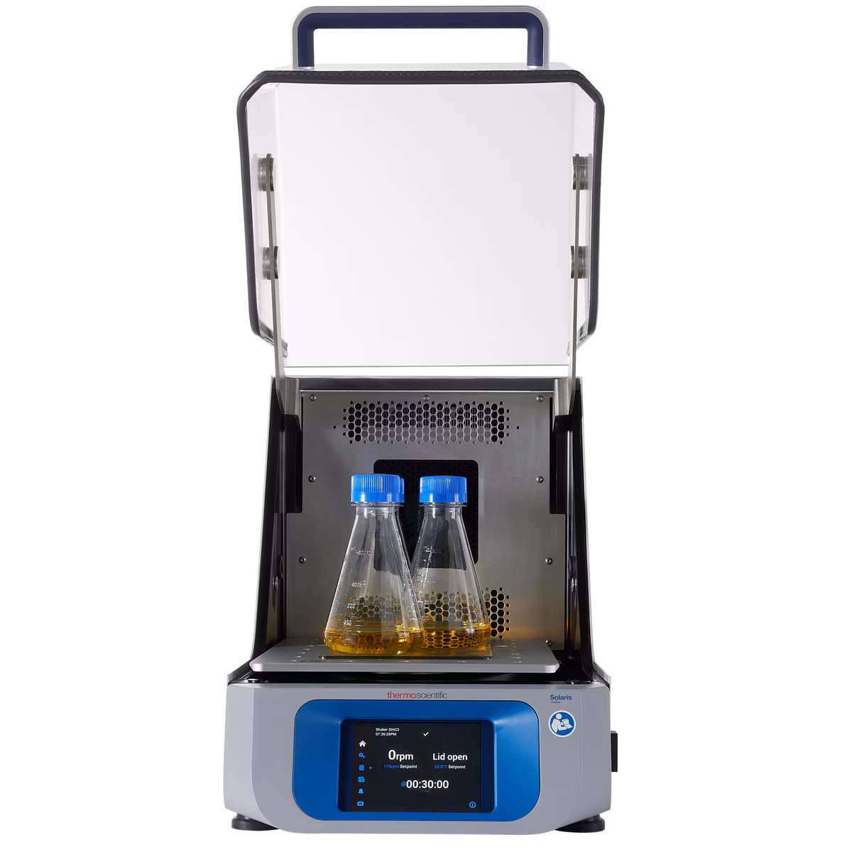 Best For: Best High-End Option The Thermo Scientific Solaris 2000 and 4000 series (Open Air and Incubated) have set a new standard for intelligent laboratory equipment since their recent introduction. These shakers combine robust mechanical engineering with a modern user interface, featuring a full-color touchscreen that simplifies programming and monitoring. The Solaris series is designed to support GMP and GLP environments where data logging, precise control, and contamination prevention are non-negotiable requirements. Key Specs Speed Range: 15 – 525 rpm Display: Full-color touchscreen with graphing Program Storage: Up to 99 unique programs Connectivity: USB and Ethernet for data export Drive Mechanism: Maintenance-free belt drive Performance & Applications